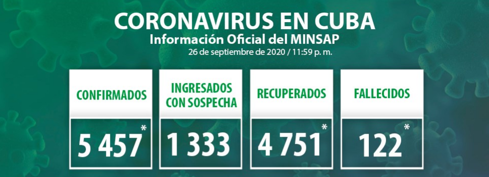 La Habana: Al cierre del día de ayer, 26 de septiembre, se encuentran ingresados en hospitales para vigilancia clínica epidemiológica 8 mil 285 pacientes, de ellos: en vigilancia 6 mil 370, sospechosos mil 333 y confirmados 582.